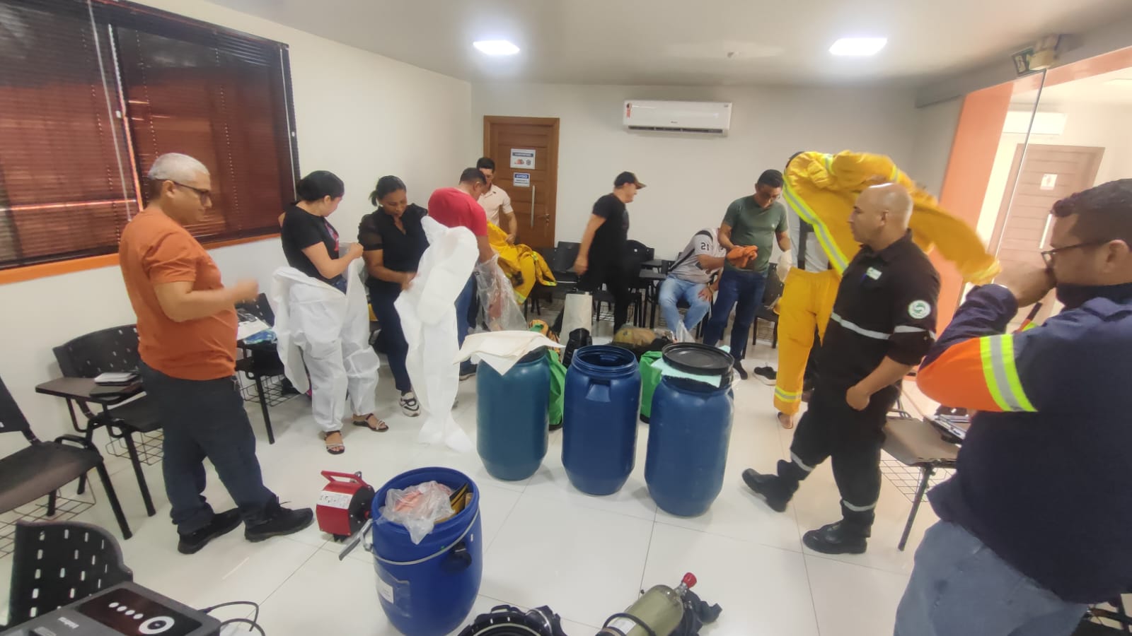 Aplicação de Kits de Emergência: Os participantes, utilizando Equipamentos de Proteção Individual (EPIs) adequados, como trajes de proteção química (Tyvek e similares amarelados) e Equipamentos de Respiração Autônoma (EPR), aplicaram barreiras de contenção absorventes (sorbents) para estancar a propagação do material simulado.
